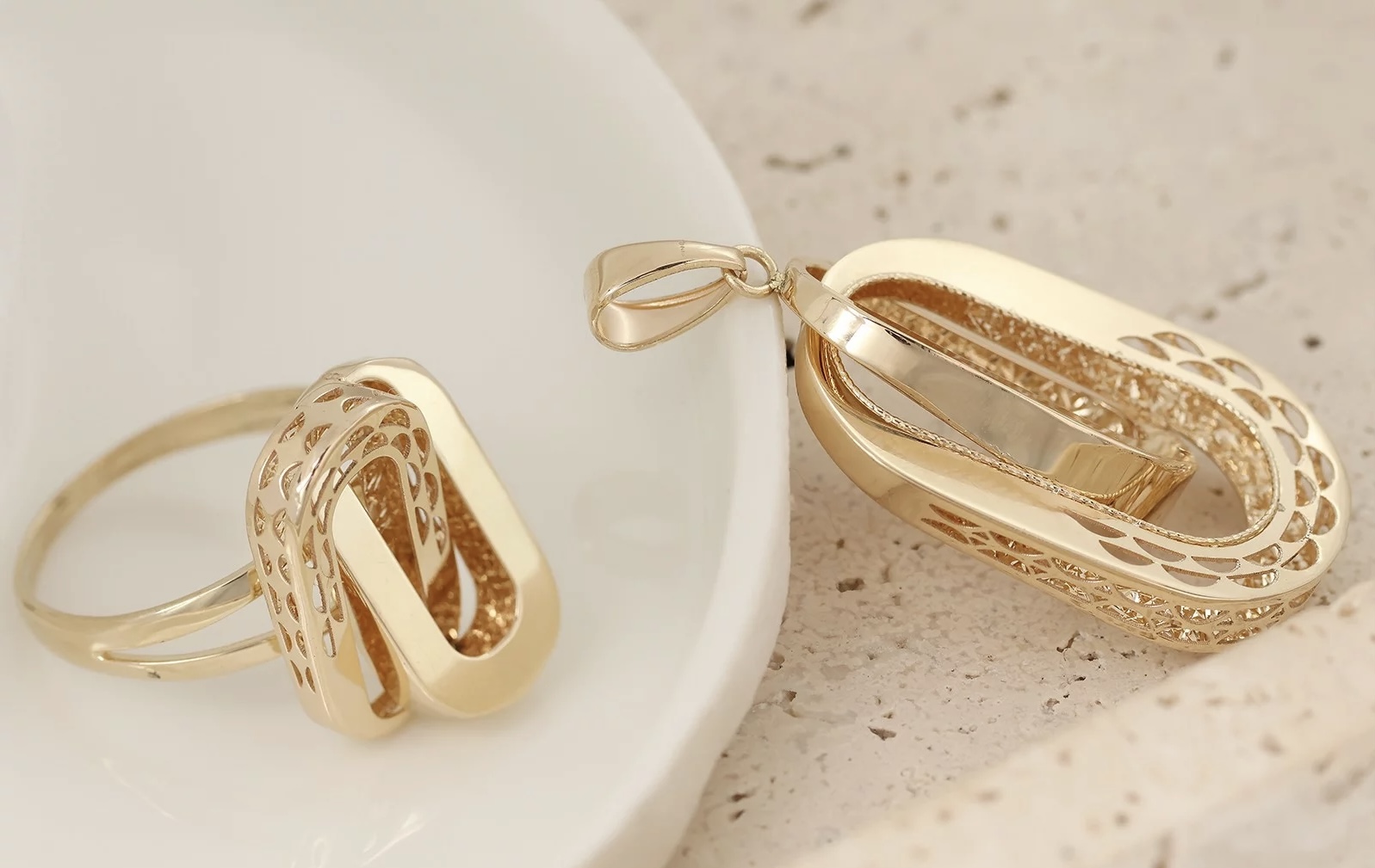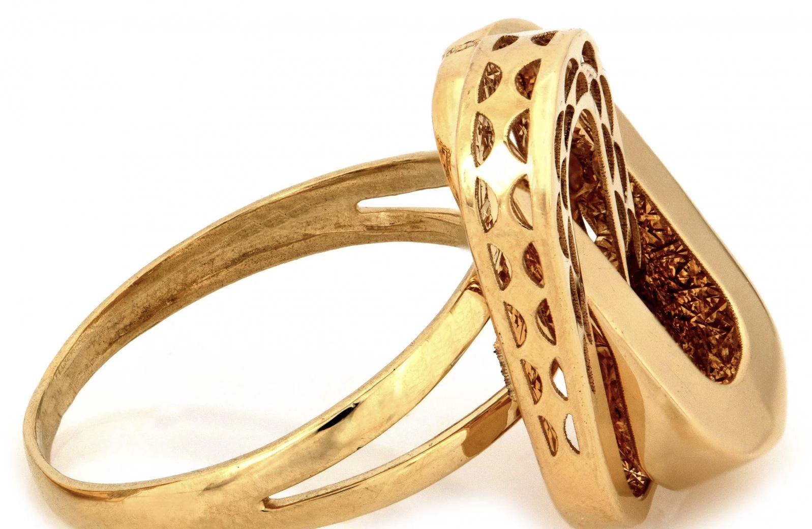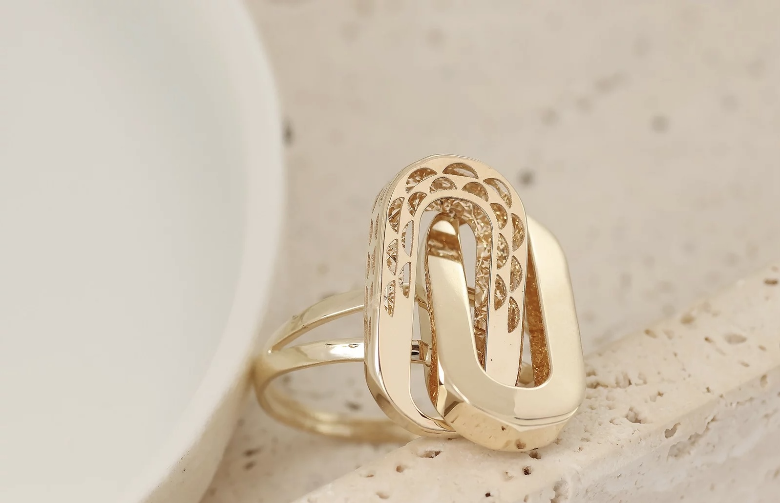 Výrazný a ženský prsteň Aurora zo 14K zlata s moderným prepletaným dizajnom a jemnými ozdobnými výrezmi. Dokonalý šperk, ktorý okamžite upúta pozornosť.