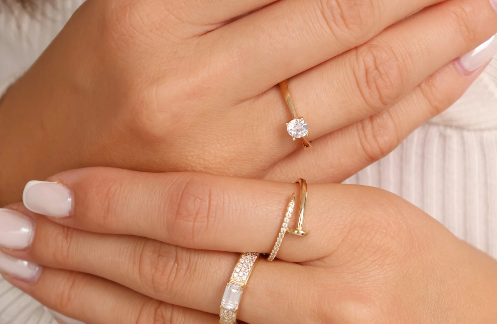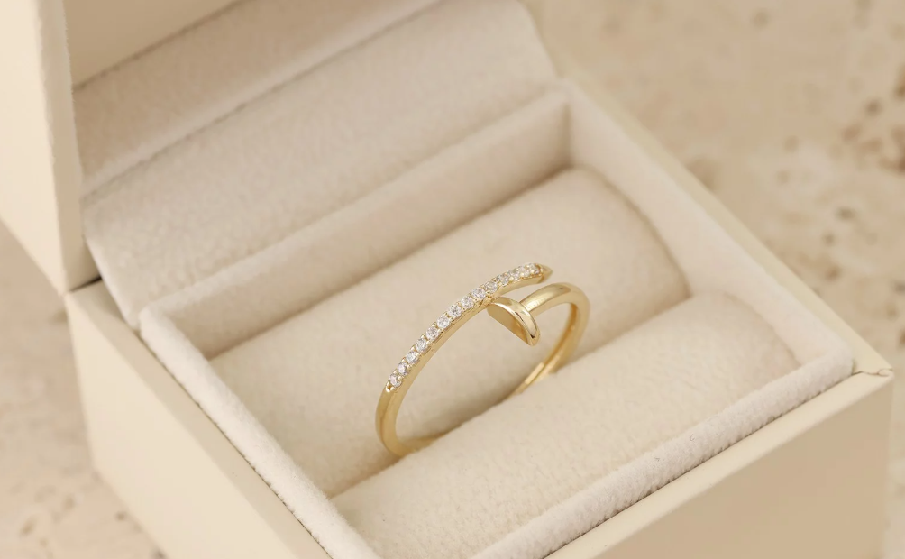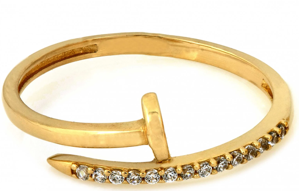 Elegantný zlatý prsteň inšpirovaný ikonickým motívom klinca, ozdobený radom trblietavých zirkónov. Výrazný, no zároveň jemný šperk pre modernú ženu.
