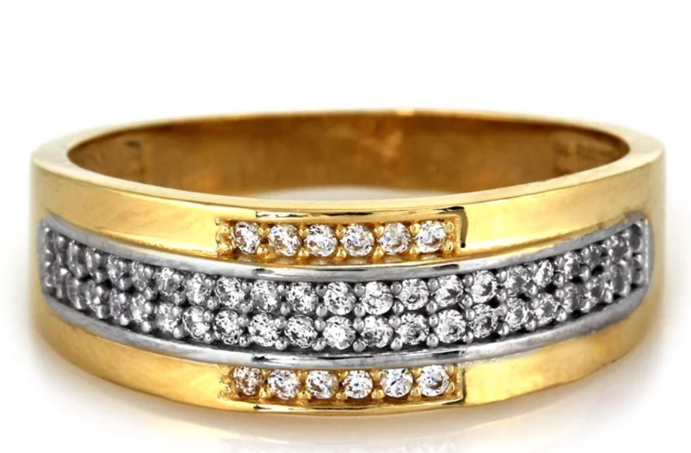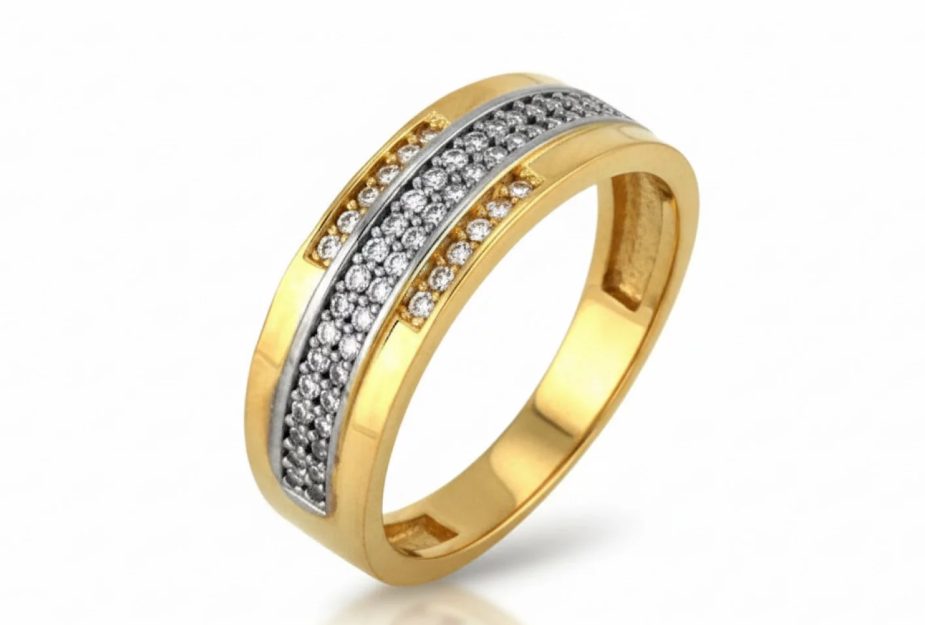 Tento zlatý prsteň vyniká harmonickým spojením hladkých zlatých plôch a bohato osadených línií čírych zirkónov. Kontrast medzi lesklým zlatom a trblietavým osadením vytvára sofistikovaný a vyvážený vzhľad, ktorý pôsobí luxusne, no zároveň veľmi vkusne.