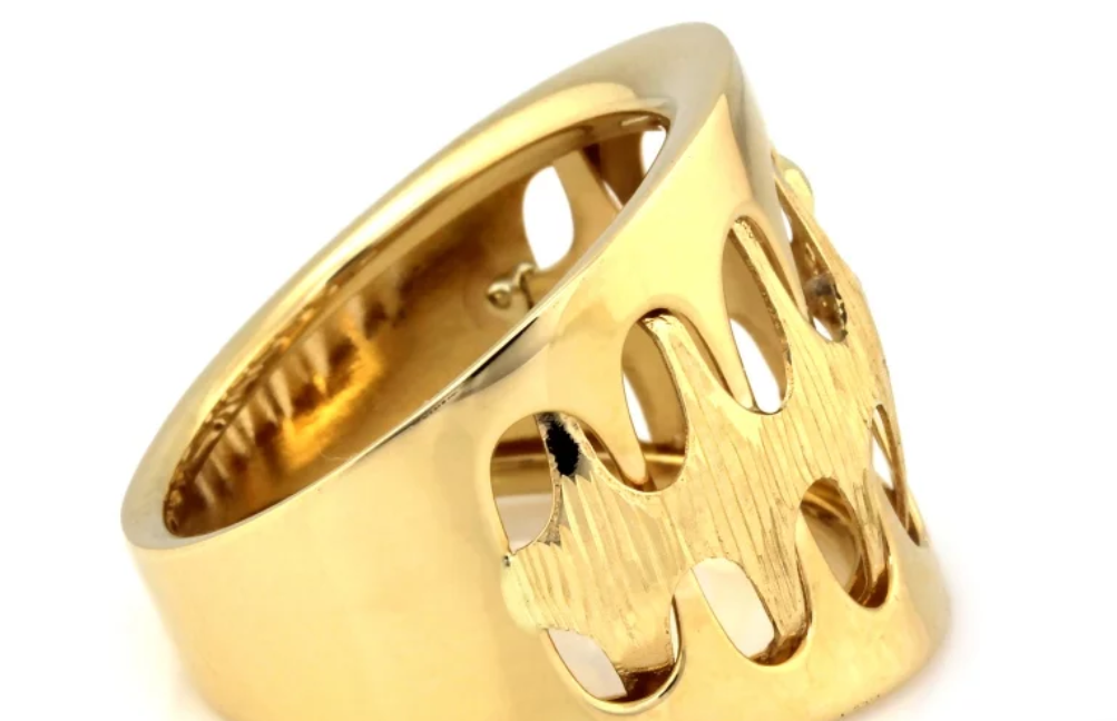 Výrazný zlatý prsteň s dekoratívnymi výrezmi a jemnou textúrou, ktorý pôsobí moderne, odvážne a zároveň elegantne.