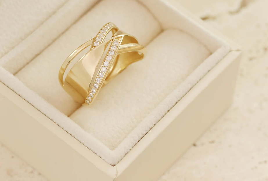 Elegantný prsteň zo 14-karátového žltého zlata s moderným prepleteným dizajnom a žiarivými bielymi zirkónmi. Spojenie jemnosti a luxusu, ktoré vynikne pri každej príležitosti.