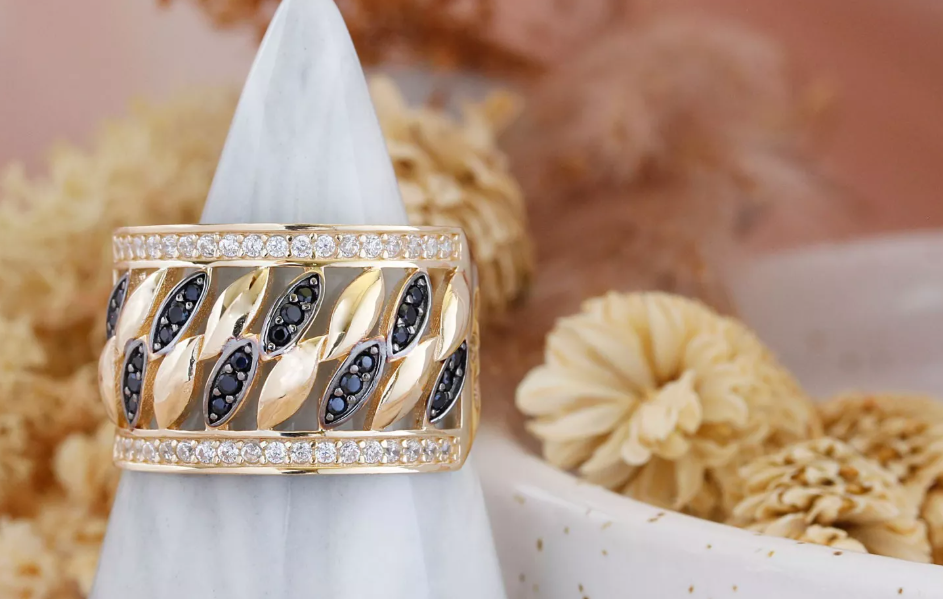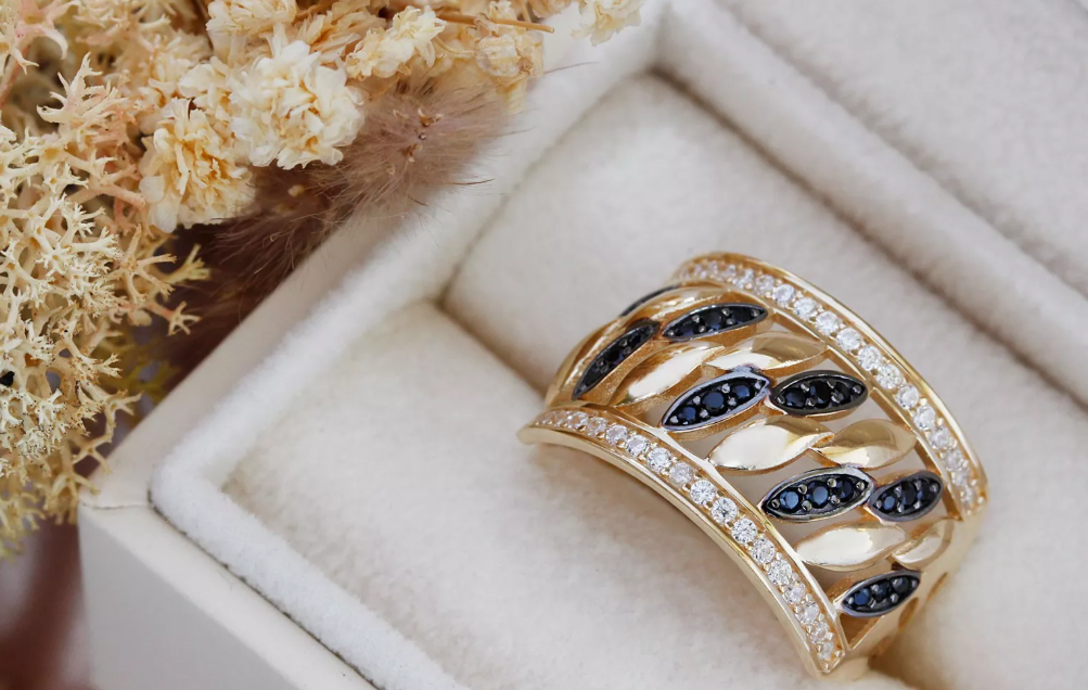 Elegantný dámsky prsteň zo 14-karátového žltého zlata zdobený čírymi a čiernymi zirkónmi v prepletenom listovom vzore. Výrazný šperk, ktorý spája luxus a moderný dizajn v jednom jedinečnom kúsku.