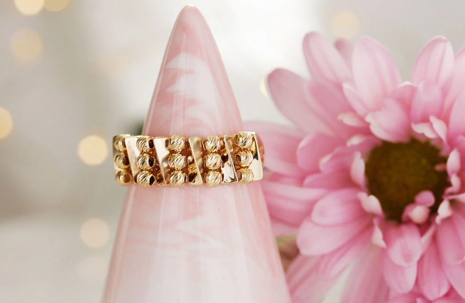 Zlatý prsteň s dekoratívnymi guľôčkami Golden Riva Ring zaujme na prvý pohľad svojím rytmickým dizajnom, v ktorom sa striedajú hladké zlaté plochy s precízne brúsenými guľôčkami. Tento detail dodáva prsteňu výraznú štruktúru a bohatý vizuálny efekt.