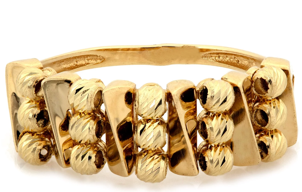 Zlatý prsteň s dekoratívnymi guľôčkami Golden Riva Ring v originálnom dizajne s rytmickým striedaním lesklých detailov. Výrazný šperk s charakterom a eleganciou.