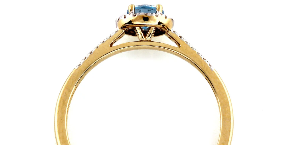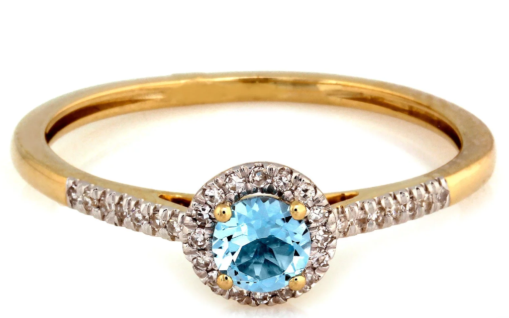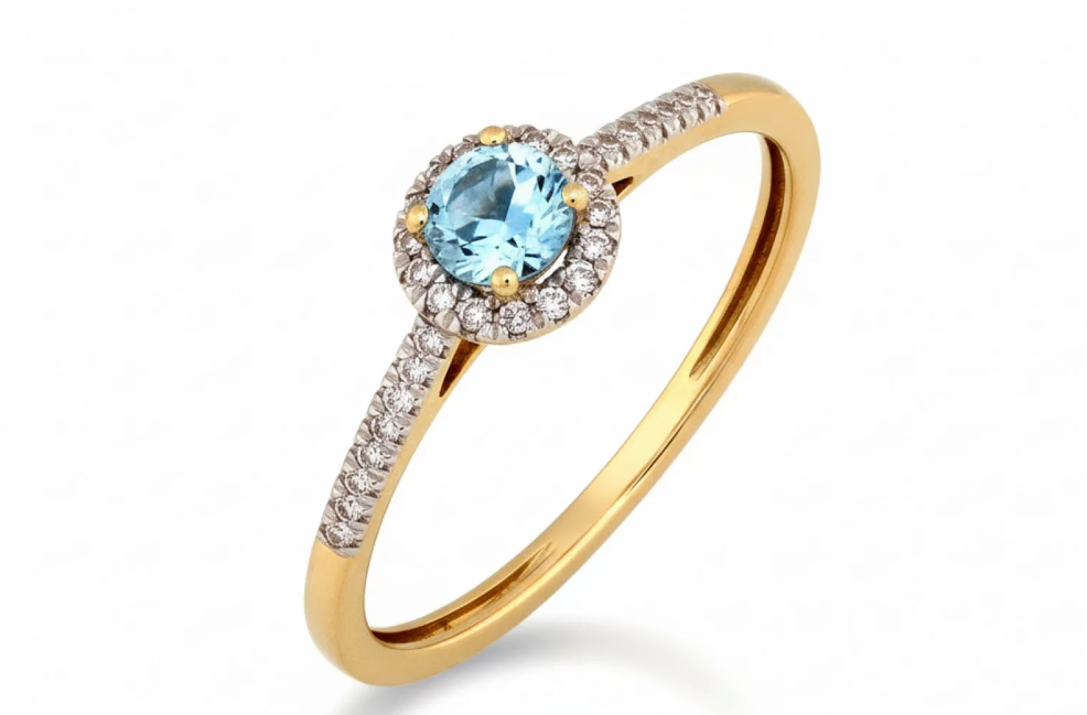 Elegantný zlatý prsteň zo 14K žltého a bieleho zlata s jemným modrým topásom a žiarivými diamantmi. Nadčasový dizajn vhodný na zásnuby aj ako výnimočný darček.