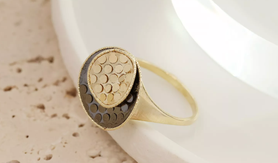 Tento zlatý prsteň je dokonalým spojením klasickej elegancie a súčasného štýlu. Jeho dominantným prvkom je okrúhly dizajn so zlatými bodkami, ktoré sú zvýraznené čiernym ródiovaním.