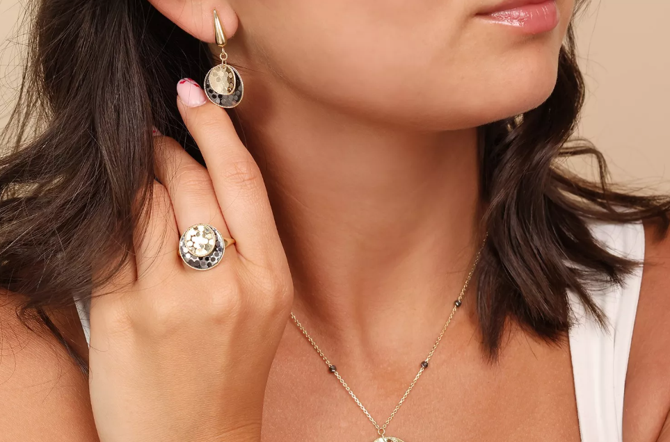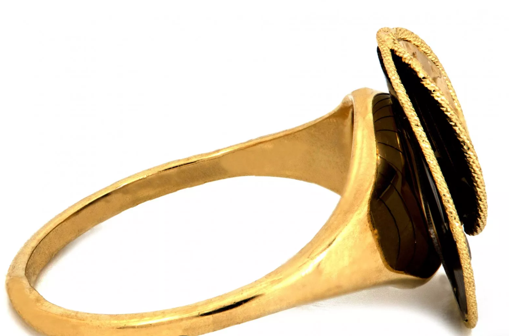 Elegantný zlatý prsteň s okrúhlymi prvkami a kontrastným čiernym ródiom, ktorý dodáva šperku moderný a výrazný vzhľad. Ideálny pre ženy, ktoré majú rady jedinečné a originálne kúsky.
