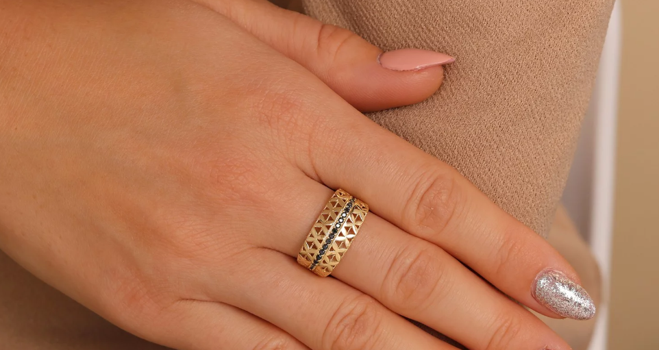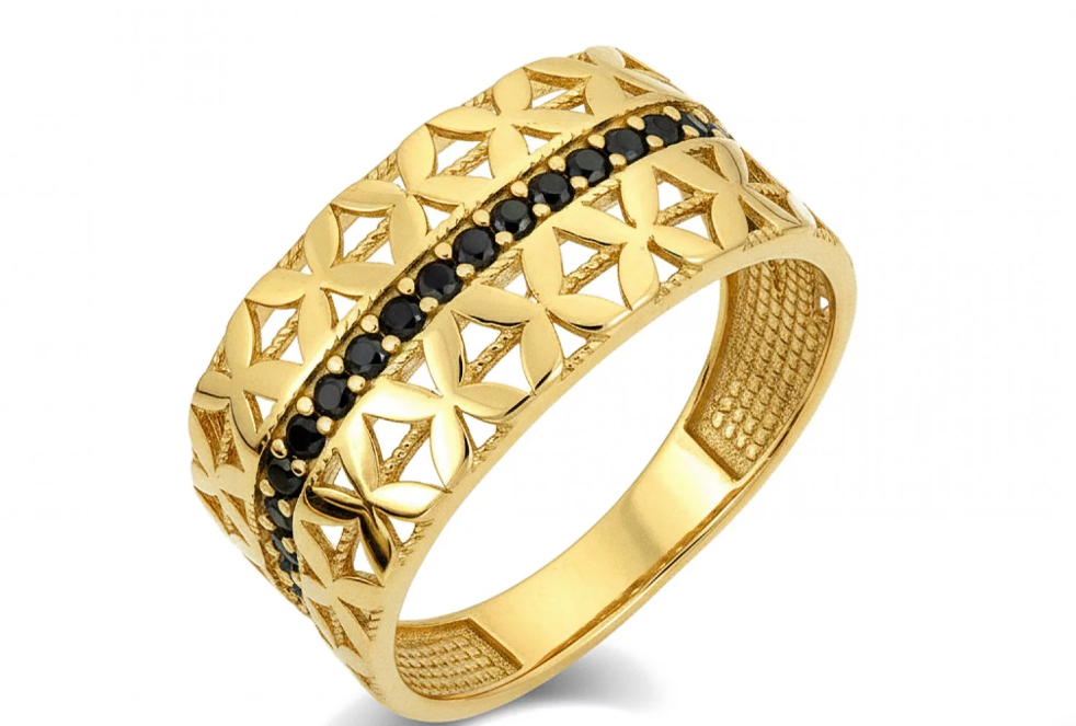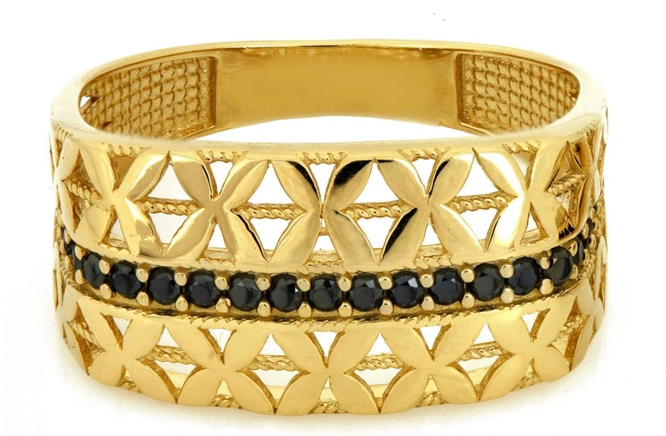 Výrazný zlatý prsteň s jemným ornamentálnym vzorom a líniou čiernych zirkónov, ktorý spája eleganciu, kontrast a nadčasový dizajn.