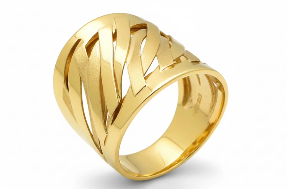 Elegantný zlatý prsteň s moderným prepletaným motívom, ktorý zaujme svojou originalitou a šírkou. Je ideálny pre ženy, ktoré hľadajú výrazný, no stále nadčasový doplnok zo 14-karátového zlata.