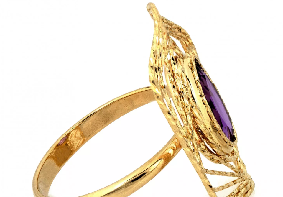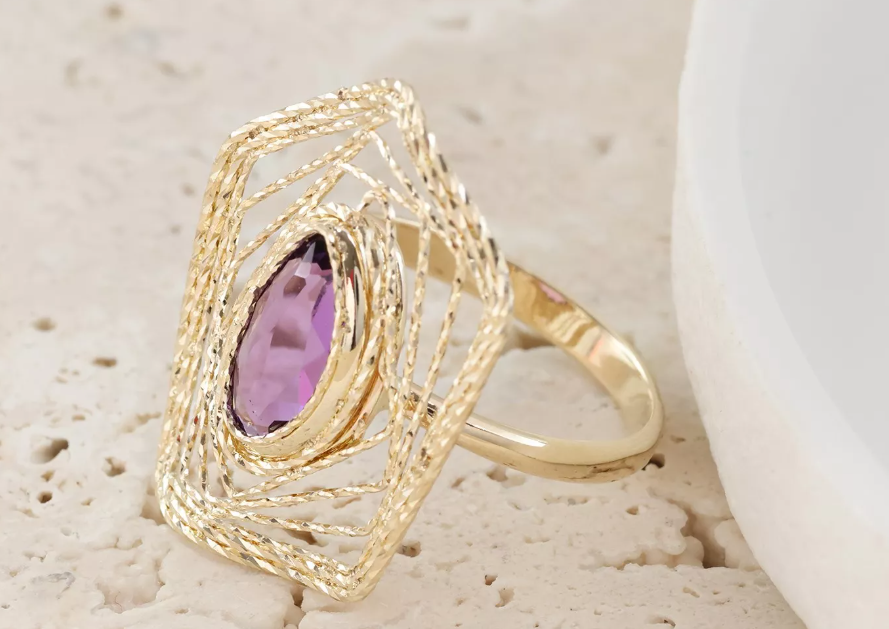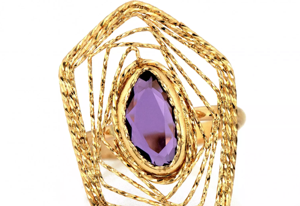 Zlatý prsteň s prírodným ametystom v originálnom dizajne