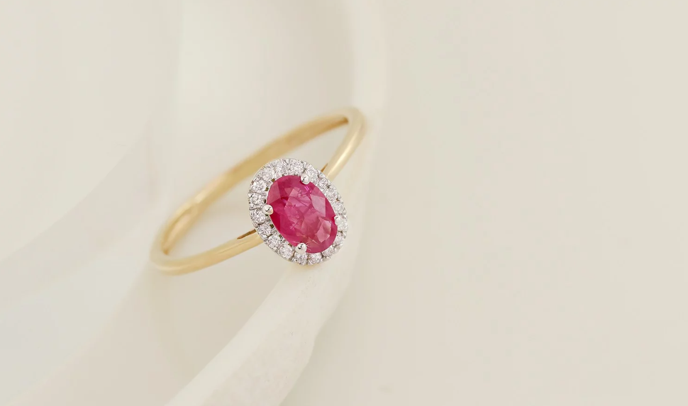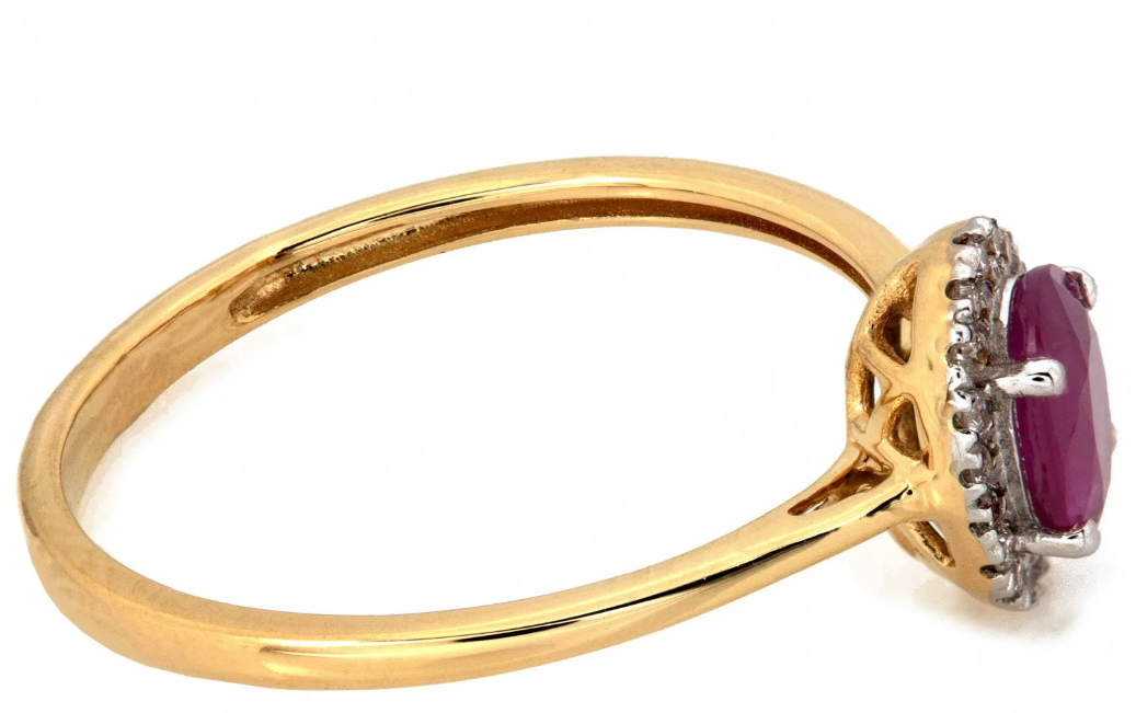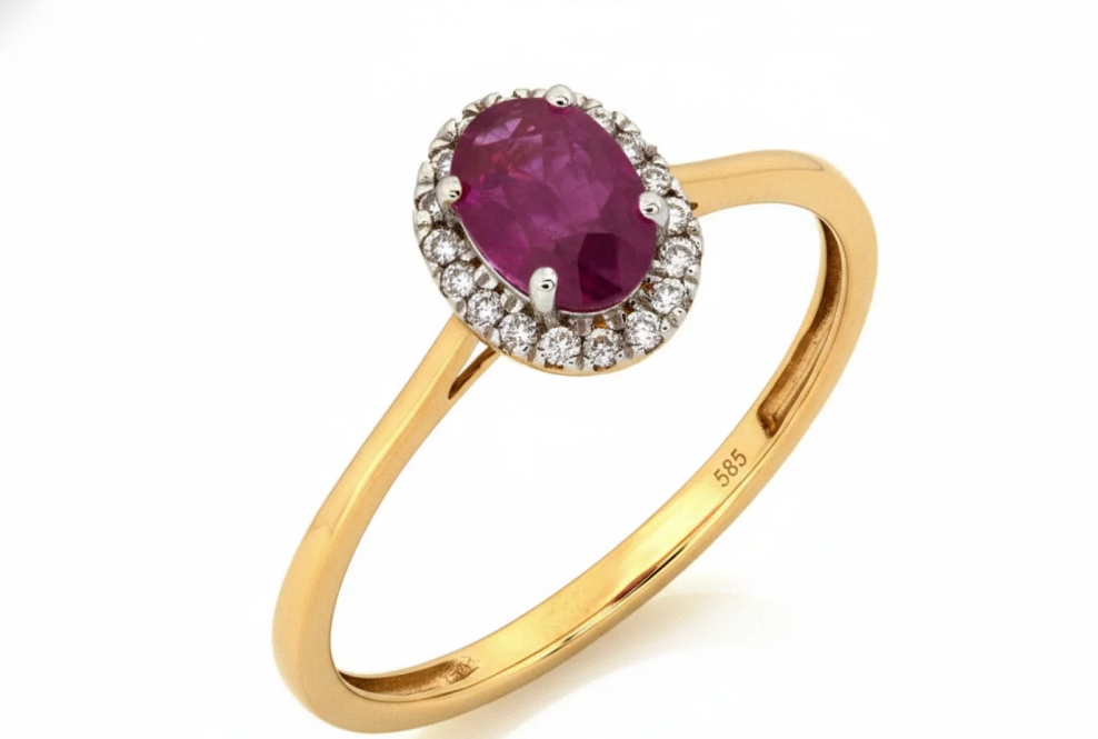 Tento elegantný zlatý prsteň zdobí výrazný oválny rubín, obklopený korunou jemných prírodných diamantov. Kombinácia sýtej červenej a žiarivého zlata vytvára nadčasový šperk, ktorý okamžite pritiahne pozornosť.Rubín je drahokam lásky, odvahy a vášne – vďaka čomu je tento prsteň ideálny ako darček z lásky, na výnimočnú udalosť alebo aj ako neobvyklý zásnubný prsteň. Diamantová obruba zvýrazňuje farbu rubínu a dodáva šperku luxusný charakter.Prsteň je ručne dokončovaný, presne osadený a nesie puncovú značku kvality. Každý kus je originál.