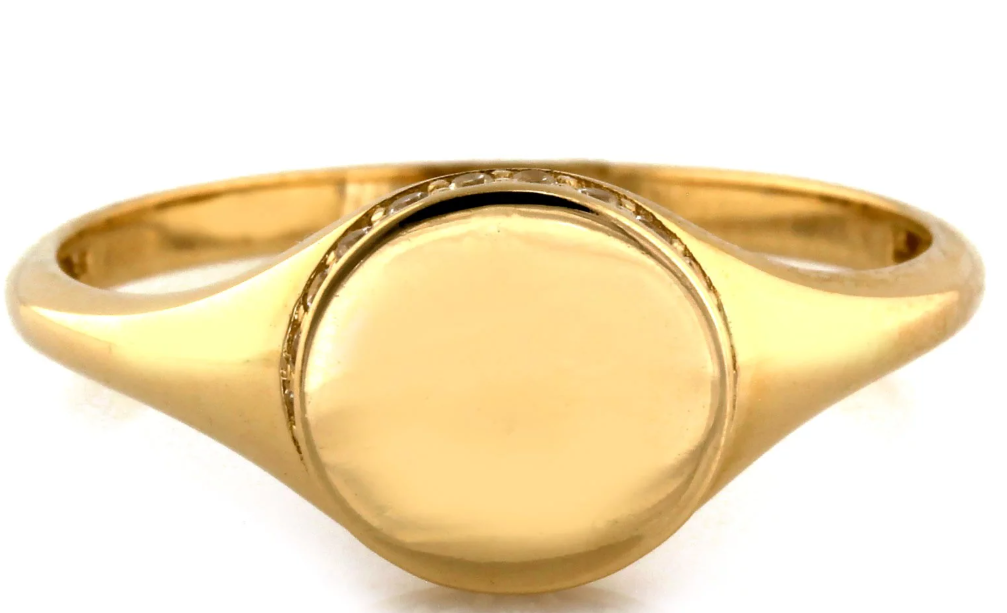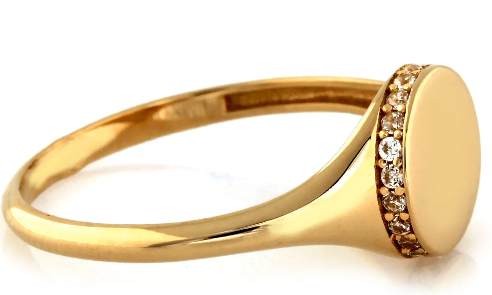 Elegantný zlatý prsteň so zirkónmi v minimalistickom dizajne, ktorý zaujme svojou čistotou a nadčasovým vzhľadom. Hladká plocha umožňuje vygravírovať iniciály, čím sa prsteň stáva jedinečným osobným šperkom.