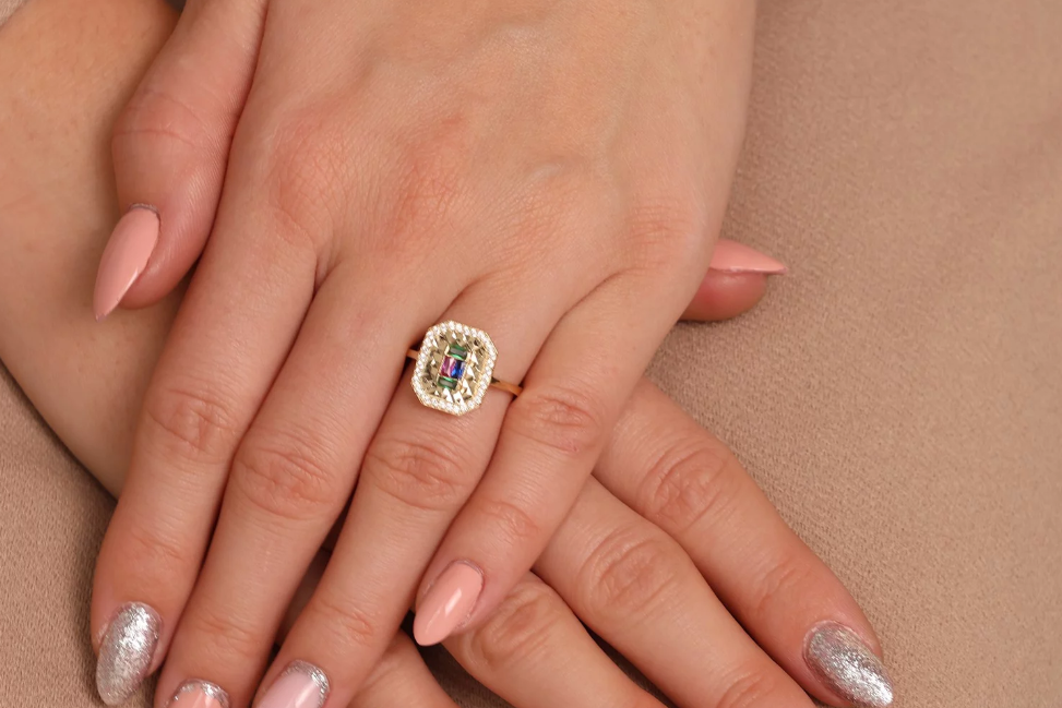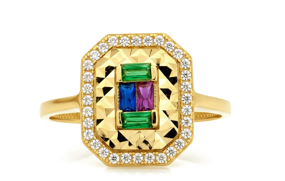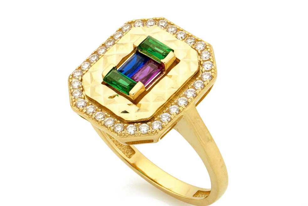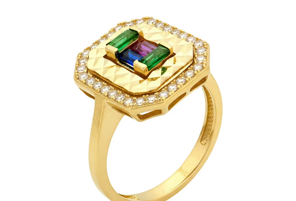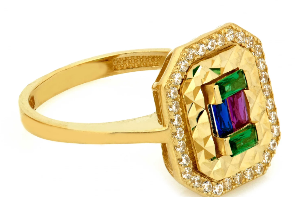Tento zlatý prsteň zaujme na prvý pohľad svojím originálnym geometrickým dizajnom a precíznym spracovaním. Dominantou prsteňa je centrálny motív z viacfarebných zirkónov v elegantných zelených, modrých a ružovo-fialových odtieňoch, ktoré sú osadené do štýlového hranatého tvaru.