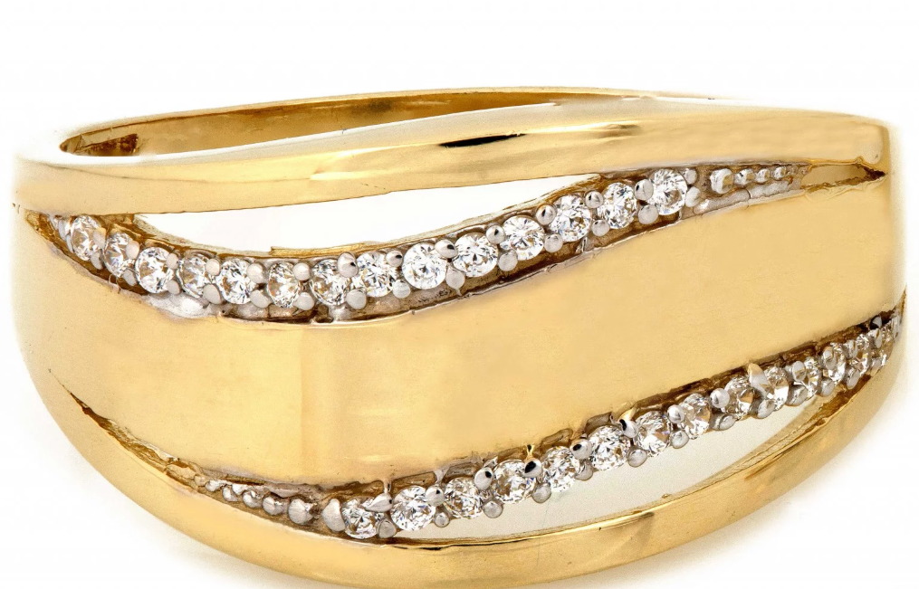 Tento nádherný prsteň je vyrobený zo 14-karátového žltého a bieleho zlata, ktoré sa prelínajú v harmonickom vlnovitom dizajne. V bielom zlate sú precízne osadené číre zirkóny, ktoré nádherne odrážajú svetlo a dodávajú šperku jedinečný lesk.