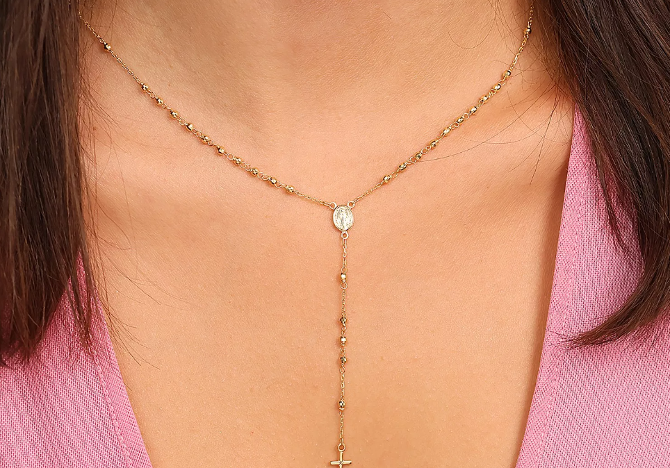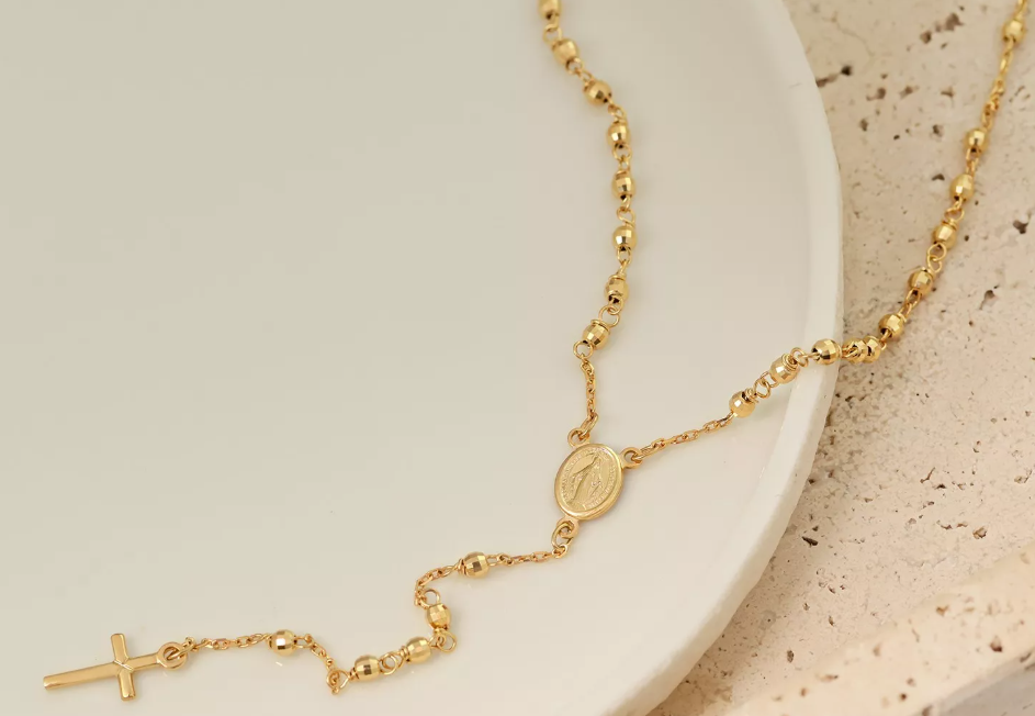 Jemný zlatý náhrdelník v štýle ruženca s drobnými guľôčkami a krížikom – elegantný symbol viery, ochrany a duchovnej sily.