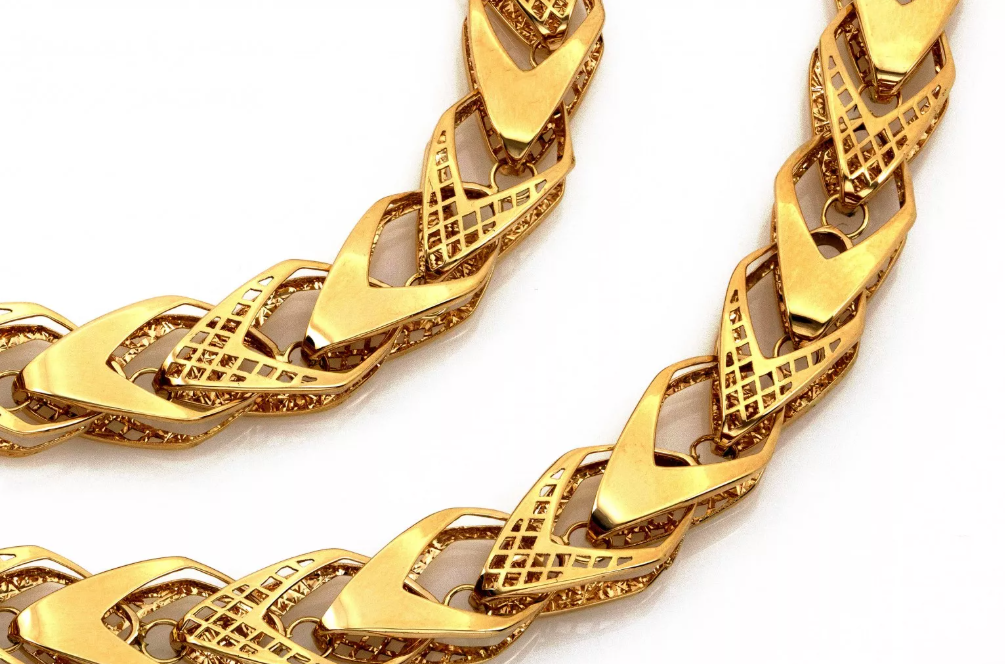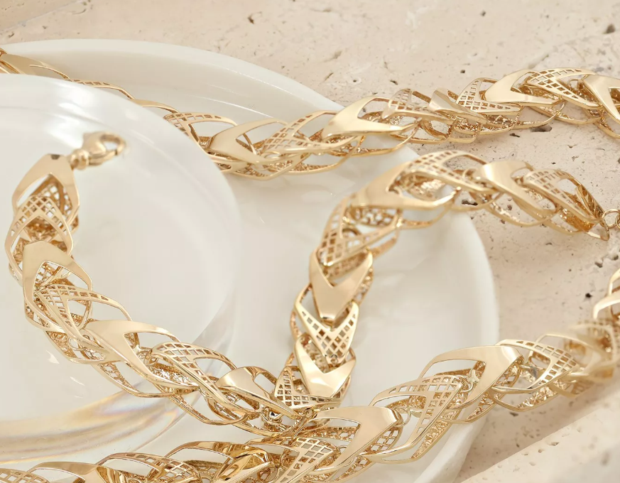 Elegantný set zo 14-karátového žltého zlata s originálnym geometrickým vzorom a precíznym prepletaným detailom. Spojenie luxusu, remeselnej precíznosti a moderného dizajnu.