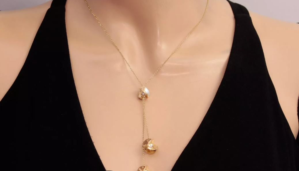 Originálny dámsky náhrdelník s dizajnom typu Y. Jeho dominantou sú tri dekoratívne guľôčky s jemným rytím a vysokým leskom, ktoré sa elegantne spúšťajú po línii krku. Vďaka svojmu tvaru nádherne predlžuje dekolt a pôsobí luxusne, no stále jemne a žensky. Hodí sa k večerným outfitom aj k jednoduchým blúzkam. Nadčasový šperk, ktorý vynikne aj samostatne bez ďalších doplnkov.